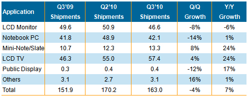 按應(yīng)用別來看,顯示器和筆記本電腦的出貨量較上一季下滑,但是第三季液晶電視和平板計算機(jī)的應(yīng)用持續(xù)成長。筆記本電腦較前季下滑了14%,是有史以來最大單季下滑,而顯示器較前季下滑了8% 。這兩個應(yīng)用產(chǎn)品的面板價格從7月到10月間呈現(xiàn)顯著的下滑,估計要到11月才會開始穩(wěn)定。9.7寸面板出貨量大幅上揚(yáng),使得迷你筆電和平板計算機(jī)的出貨量較前季成長8 %,整體出貨量從2010年第二季的3百萬片,成長到第三季的5百60萬片。