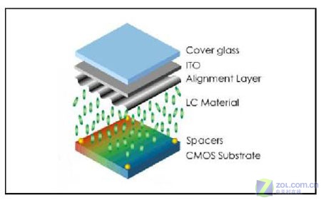 LCOS面板的結(jié)構(gòu)有些類(lèi)似TFTLCD,一樣是在上下二層基板中間撒布Spacer以加以隔絕后,再填充液晶于基板間形成光閥,藉由電路的開(kāi)關(guān)以推動(dòng)液晶分子的旋轉(zhuǎn),以決定畫(huà)面的明與暗。LCOS面板的上基板是ITO導(dǎo)電玻璃,下基板是則矽晶圓CMOS基板,LCOS面板最大的特色在于下基板的材質(zhì)是單晶矽,因此擁有良好的電子移動(dòng)率,而且單晶矽可形成較細(xì)的線路,因此與現(xiàn)有的HTPSLCD及DLP投影面板相較,LCOS是比較容易達(dá)成高解析度的投影技術(shù)。