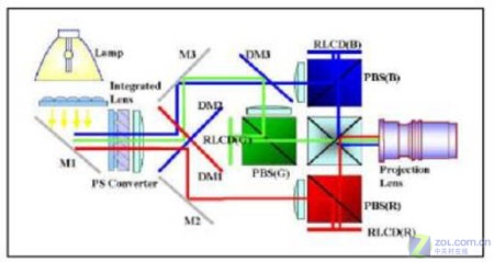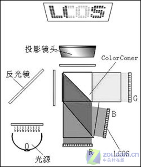 投影機(jī)技術(shù)基本顯影原理相仿,主要是由鹵素?zé)?、氙氣燈等發(fā)光,集光至面板,將面板的影像經(jīng)反射或透射投射出影像,再經(jīng)過(guò)分光、合光系統(tǒng),最后將影像投射到屏幕顯像。LCOS(LiquidCrystalonSilicon)是一種全新的數(shù)碼成像技術(shù),它采用半導(dǎo)體CMOS集成電路芯片作為反射式LCD的基片,CMOS芯片上涂有薄薄的一層液晶硅,控制電路置于顯示裝置的后面,可以提高透光率,從而實(shí)現(xiàn)更大的光輸出和更高的分辨率。
