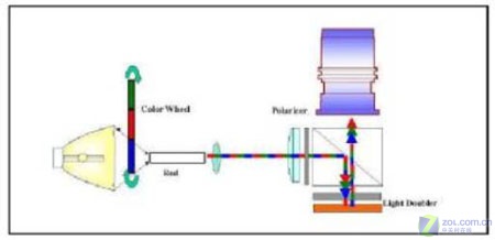 單片式ColorWheel光學(xué)引擎則是以快速旋轉(zhuǎn)的ColorSwitch將白光形成循序的紅、藍(lán)、綠光,并將三原色光與驅(qū)動(dòng)程式產(chǎn)生的紅、藍(lán)、綠畫(huà)面,同步形成分色影像,再藉由人眼視覺(jué)暫留的特性,最后在人腦產(chǎn)生彩色的投影畫(huà)面。類(lèi)似的技術(shù)有:Displaytech發(fā)表的FieldSequentialColor、Philip所采用的ScrollingColor-RotatingPrism架構(gòu)、及JVC采用的SpatialColor–Hologram架構(gòu)。[page]