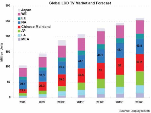 2010年全球MOCVD新增安裝量中,由于受到LED背光在LCD TV滲透的加快帶動(dòng)下, LCD TV制造強(qiáng)國的韓國增量最多,其次是臺(tái)灣地區(qū)。根據(jù)SEMI統(tǒng)計(jì),中國大陸今年MOCVD新增量大概在177臺(tái),出貨量居全球第三。另外,根據(jù)SEMI統(tǒng)計(jì)和分析,結(jié)合MOCVD供應(yīng)情況,2011年中國MOCVD新增量份額有望達(dá)到全球的40%,而其它地區(qū)的增量會(huì)保持與2010年相當(dāng)?shù)乃交蛳陆怠?