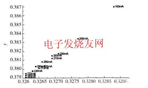 現(xiàn)在LED的發(fā)光顏色越來越豐富,LED的色坐標(biāo)參數(shù)是LED重要的物理參數(shù)之一,隨著注入電流的增加,器件出光的色坐標(biāo)在一定程度上減小,如圖1所示。