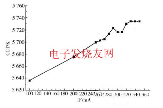 從圖2中可以看出,隨著器件的驅(qū)動電流增加,功率型白光LED的色溫從100mA電流時的5636K增加到350mA電流時的5734K。這是因?yàn)?,電流加大后,芯片發(fā)出的藍(lán)光增多,熒光粉層的厚度是一定的,則在出射的白光中藍(lán)光成份增加,從而使器件的色溫增加。