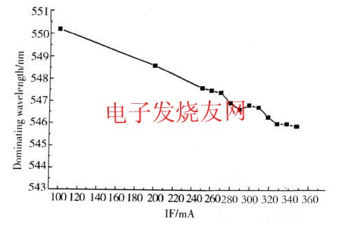 隨著電流增加,器件出光的主波長在減小,這是因?yàn)殡娏髟黾樱鴺?biāo)減小,標(biāo)準(zhǔn)白光點(diǎn)和色坐標(biāo)點(diǎn)的連線的延長線與380~760nm的光譜軌跡相交點(diǎn)對應(yīng)的波長值變小。