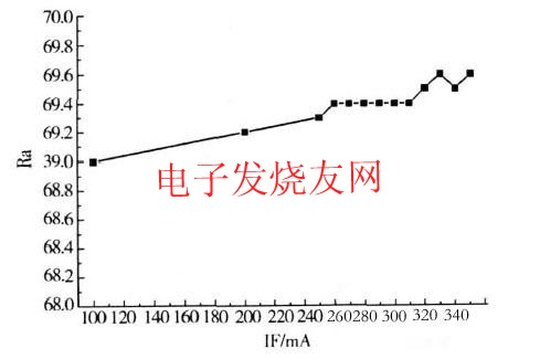 由于藍(lán)光LED與$熒光粉組成的白光系統(tǒng),其光譜中缺少紅光成分,顯色指數(shù)還不理想,這也是目前業(yè)界研究的重點(diǎn)課題。顯色指數(shù)與光譜成分有關(guān),電流增加但并不影響出光的光譜的分布,所以器件的顯色指數(shù)幾乎沒有變化。