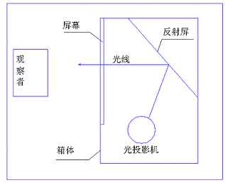 背投(RearProjector)的定義是相對于傳統(tǒng)的前投(FrontProjector)而言的。二者的主要區(qū)別在于圖像光線的來源方式。前投系統(tǒng)中,觀察者和投影機位于反射屏幕的同一側,投影機投射出的光線照射到屏幕后,再經過反射到達觀察者;而背投系統(tǒng)中,觀察者和投影機位于顯示屏幕的兩側,從投影機發(fā)出的光線照射到半透明的顯示屏幕上,部分透過后形成圖像,所以觀察者看到的是透射出來的光,其原理如圖1: