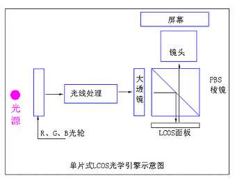 LCOS顯示面板其中一面以CMOS芯片為基板,無法讓光線直接穿過,因此采用穿透式成像方式,因此其背投光學系統(tǒng)和LCD背投影機便產生了區(qū)別。通常LCOS光學系統(tǒng)中需要利用偏極化分光鏡(PolarizationBeamSplitter:PBS),將入射LCOS面板的光線與反射的光線分開。PBS是由兩個45度等腰直角棱鏡底邊粘合的而成的棱鏡,當非線性偏極化光入射PBS時,PBS會反射入射光的S偏振光(垂直入射線平面),并且讓P偏振光(平行入射線平面)通過。關于LCOS光學系統(tǒng)技術仍在起步階段,所以IBM、ColorQuad、Philip、Hologram等多家廠商都開發(fā)了不同的LCOS光學引擎架構。但主要可分為單片式和三片式兩大類,如下: