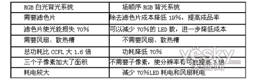 另外,即將在液晶電視中規(guī)?;瘧?yīng)用的RGBLED背光系統(tǒng),相對(duì)傳統(tǒng)白色LED背光系統(tǒng)省去濾色片后,在大幅提高整體光源利用率的前提下,即使LED的發(fā)光最大值略低于CCFL,但CCFL系統(tǒng)可憐的光利用率,致使RGBLED系統(tǒng)總體光利用率仍然比CCFL高,而且LED的本身發(fā)光效率還在逐年提高。