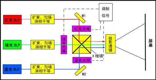 以投影方式為激光顯示解決方案的工作原理如圖1.1所示:紅、綠、藍(lán)三色激光分別經(jīng)過擴(kuò)束、勻場(chǎng)、消相干后入射到相對(duì)應(yīng)的光閥上,光閥上加有圖像調(diào)制信號(hào),經(jīng)調(diào)制后的三色激光由X棱鏡合色后入射到投影物鏡,最后經(jīng)投影物鏡投射到屏幕,得到激光顯示圖像。