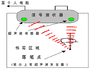 超聲波技術(shù)的原理是:利用超聲波的傳輸速度較慢的特性,根據(jù)超聲波發(fā)射到接收時間計算出發(fā)射點到接收點的距離。使用在平面定位上的原理采用的是在屏幕的一邊放置兩個按固定距離分布的超聲接收裝置,用于定位的筆是一個超聲波發(fā)射器,當(dāng)筆移動在屏幕的表面時,所發(fā)射的超聲波沿屏幕表面被接收器檢測到,由收到超聲波的時間可以換算出筆與兩個接收器的距離。采用三點定位的原理,即根據(jù)三角形已知三個邊長可以確定筆所在的頂點原理,計算出筆所在的位置坐標(biāo)。是一種測距定位模式。