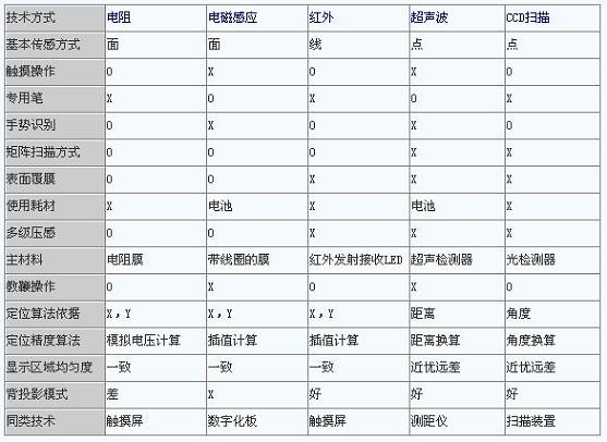 綜上所述,交互式電子白板采用不同的定位方式,則會有不同的特點和性能。下表將上面的文字內(nèi)容進行總結(jié)和對比,相信讀者能分清各種技術(shù)的差異,選擇適合自己的一款產(chǎn)品。
