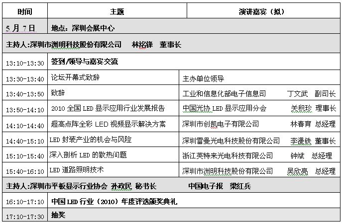 1.講座 主辦方將邀請(qǐng)國內(nèi)知名LED行業(yè)專家分析2010年中國LED產(chǎn)業(yè)發(fā)展問題、2011年中國LED企業(yè)的總戰(zhàn)略及調(diào)整方向,預(yù)測中國LED市場各領(lǐng)域(原材料、設(shè)備、外延芯片、顯示屏、照明等)的投資情況分析及趨勢。
