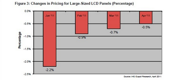 據(jù)IHS iSuppli公司的研究,4月份大尺寸液晶面板的價格降幅預(yù)計小于1%,日本地震與海嘯對其影響顯然不大。
