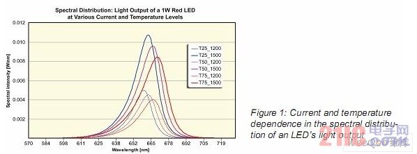 LED的光輸出特性主要取決于其工作條件。前向電流增加會(huì)使LED產(chǎn)生更多的光。但當(dāng)前向電流保持不變,光輸出會(huì)隨著LED的溫度升高而下降。圖1描述了溫度,電流和光輸出的關(guān)系。并且描述了一個(gè)LED相關(guān)的顏色光譜在峰值波長(zhǎng)處的偏移。用于普通照明的單色LED,藍(lán)色光譜的峰值會(huì)發(fā)生偏移,因此改變了LED所謂的色溫。這會(huì)對(duì)LED照明空間內(nèi)的感官產(chǎn)生影響。