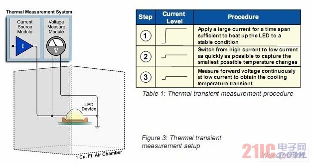 圖3描繪了此類(lèi)測(cè)量裝置的簡(jiǎn)圖(不成比例)。測(cè)量的第一步是確定前向電壓在一個(gè)非常小的電流下的溫度敏感性,這個(gè)小電流可以是傳感器或測(cè)量電流。之后,LED被施加一個(gè)大電流,從而使其變熱。接著停止施加大電流,并且很小的傳感器電流再次出現(xiàn),同時(shí)用一個(gè)高采樣率完成前向電壓的測(cè)量,直至LED結(jié)溫完全趨于穩(wěn)定。由于LED快速的熱響應(yīng),所以測(cè)量的硬件設(shè)備必須能夠捕捉LED電流停止施加后幾微秒內(nèi)的溫度(電壓)改變。如圖3所示,被測(cè)量的LED處于一個(gè)封閉空間內(nèi),這個(gè)封閉空間是JEDEC標(biāo)準(zhǔn)的自然對(duì)流腔,它提供了一個(gè)沒(méi)有氣流流通的環(huán)境。T3STer也可以提供類(lèi)似的裝置。表格1歸納了測(cè)試步驟。