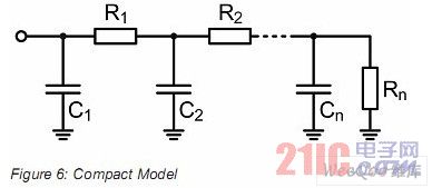 結(jié)構(gòu)函數(shù)可以進(jìn)一步轉(zhuǎn)變成簡(jiǎn)化模型,也就是一個(gè)包含熱阻熱容的等效網(wǎng)絡(luò),它包含了結(jié)構(gòu)函數(shù)圖形中所包含的所有數(shù)值。圖6描述了類(lèi)似功率LED等半導(dǎo)體元件的一個(gè)通用模型。當(dāng)然,實(shí)際的模型中R和C會(huì)有具體的數(shù)值。