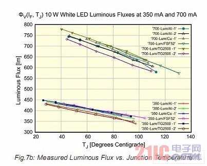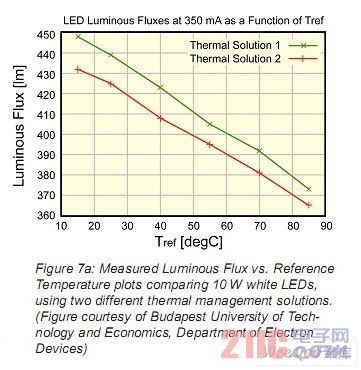 在圖7a中顯示了兩個(gè)同一廠商的兩個(gè)白色LED光通量和參考溫度的關(guān)系,這兩個(gè)LED具有不同的散熱方式。散熱方式1使用了一塊金屬的PCB板,而散熱方式2使用了傳統(tǒng)的FR4板。此外,兩個(gè)LED樣品的PCB板和散熱器之間使用了不同的導(dǎo)熱界面材料。