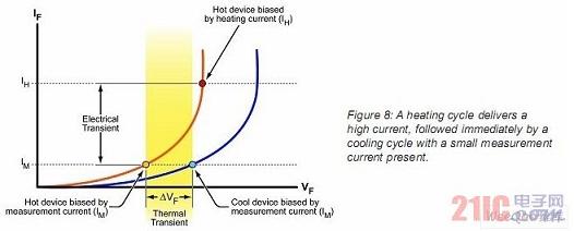 注意,當(dāng)PN結(jié)前向電流突然被停止(在測(cè)試過(guò)程中),不可避免的發(fā)生電瞬態(tài)現(xiàn)象。這個(gè)瞬態(tài)現(xiàn)象會(huì)持續(xù)很短的一段時(shí)間,在這段時(shí)間內(nèi)前向電壓的改變無(wú)法描述LED芯片的溫度的改變。因此,在進(jìn)行測(cè)量時(shí)必須給電瞬態(tài)現(xiàn)象消失留有一個(gè)時(shí)間上的延遲。