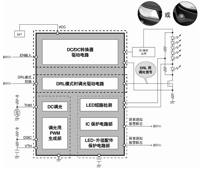最近,汽車用前照燈正在逐漸推進LED化,以高效、長壽這一優(yōu)點為背景,未來有望成為前照燈市場的重心。此外為確保車輛安全、可見度,安裝使用LED前照燈的事例會不斷增加,而未來預計LED前照燈/DRL的搭載也將面向車載用途形成標準規(guī)格系列。目前,LED前照燈只限于高級豪華車等一部分的車型上選用,對汽車制造商、前照燈制造商來說,多采用延用通用的LED驅動IC,或以分立元器件為主構成的形式,如果裝載DRL就需要另外配備與其相配的驅動電路。羅姆針對未來前照燈的LED化,率先著手開發(fā)了一款專用的IC,并推動獲得前照燈用LED驅動器所需功能的專用IC的開發(fā)。此次羅姆新開發(fā)的這種前照燈專用LED驅動IC,特別面向歐美等國先行開始普及的DRL,通過內置振蕩器電路實現(xiàn)微處理器控制的PWM調光。另外,為對應要求高可靠性的車載市場需求,在搭載能監(jiān)測LED短路、LED開路等前照燈故障的各種保護功能,與分裝器件構成時或與通用的LED驅動IC組成時的情況相比,通過削減部件數(shù)量從而實現(xiàn)了可靠性的大幅提高。另外,絕對最大電壓設定為50V,對于鋰離子電池電壓波動也能非常輕松地承受的高耐壓化也得以實現(xiàn)。