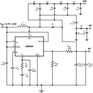 如今各種微型電壓升降壓芯片技術(shù)也日顯成熟,產(chǎn)品也在不斷增加,符合PMP/MP4、DSC、DV的TFT-LCD需要的,能同時(shí)多路輸出它們需要的不同電壓的集成電源管理芯片組(SOC)也在迅速推出之中。TFT-LCD顯示器系統(tǒng)需要多檔電源電壓,如PMP/MP4常用的三星3.5_和4_的TFT-LCD,它們的結(jié)構(gòu)如圖3所示,它們由TFT玻璃(TFTglass)、顏色濾波器(Colorfilter)、顯示區(qū)(Displayarea)、背光板和背光源(Backlight)四部分疊加組成。圖4是三星3.5_的TFT-LCD電路圖。它們的主要技術(shù)參數(shù)是:VIN=2.1-4.0V,VSW=15V/1.4A、VS=15V;用6個(gè)LED串聯(lián)做背光源,每個(gè)LED的VF=3.4V、IF=20mA,因此需要一個(gè)24V/50mA的電壓來驅(qū)動(dòng)。常常選用帶電感的DC/DC來升壓,再加上倍壓電路,輸出多檔電源電壓滿足TFT-LCD的需要,如圖5所示。目前MP3、PMP/MP4、DSC、DV等的小尺寸TFT-LCD屏的低成本背光驅(qū)動(dòng)方案常常是采用這種方法來設(shè)計(jì)實(shí)用電路的。