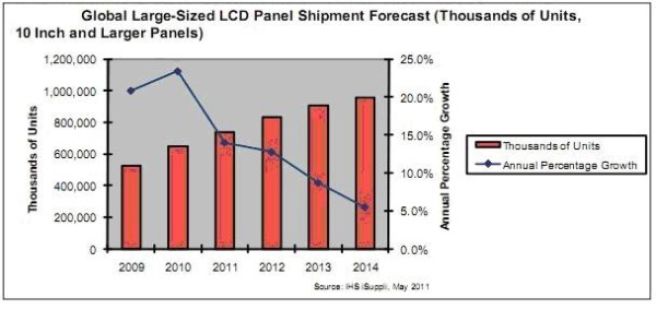 IHS iSuppli公司的研究顯示,第一季度電視、臺式電腦顯示器和筆記本電腦的消費需求低迷,將導(dǎo)致2011年全球大尺寸液晶面板出貨量增長速度低于2010和2009年。2011年全球大尺寸液晶面板出貨量將僅增長14%,而2010和2009年分別是23.4%和20.8%。今年的單位出貨量將為7.4億塊,高于2010年的6.493億塊。