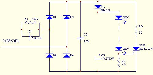 在圖二電路中﹐可控硅SCR及R3組成保護電路﹐當流過LED的電流大于設定值時﹐SCR導通一定的角度﹐從而對電路電流進行分流﹐使LED工作于恒流狀態(tài)﹐從而避免LED因瞬間高壓而損壞。