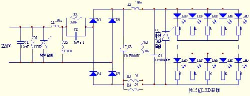 在圖三電路中﹐C1﹑R1﹑壓敏電阻﹑L1﹑R2組成電源初級濾波電路﹐能將輸入瞬間高壓濾除﹐C2﹑R2組成降壓電路﹐C3﹑C4﹑L2﹑及壓敏電阻組成整流后的濾波電路。此電路采用雙重濾波電路﹐能有效地保護LED不被瞬間高壓擊穿損壞。