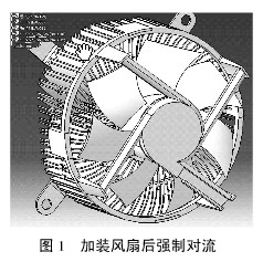 主動散熱常用液冷、熱管、風(fēng)冷等方式。由于液冷使用的液體必須在泵的帶動下強制循環(huán)帶走散熱器的熱量,熱管則依靠高導(dǎo)熱性能的傳熱元件在全封閉真空管內(nèi)的液體的蒸發(fā)與凝結(jié)來傳遞熱量,二者都不適合車燈內(nèi)使用。風(fēng)冷散熱具有價格較低、安裝簡單等優(yōu)點最為常用。針對被動散熱方式存在的散熱器中心區(qū)域溫度相對集中的情況,加裝風(fēng)扇強制對流后(見圖1),對緩解散熱器溫度不均勻有明顯效果。
