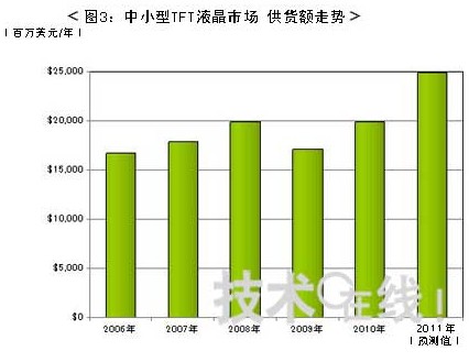 圖3表示中小型液晶市場(chǎng)過(guò)去5年內(nèi)的業(yè)績(jī)與今年的供貨額預(yù)測(cè)。手機(jī)及數(shù)碼相機(jī)等使用的中小型FPD因價(jià)格不斷降低,市場(chǎng)范圍逐步擴(kuò)大,導(dǎo)致中小型液晶 市場(chǎng)的供貨額與供貨量增長(zhǎng)幅度相比,持續(xù)出現(xiàn)了低增長(zhǎng),因2008年雷曼危機(jī)后消費(fèi)低迷,這一市場(chǎng)陷入了供貨額大幅減少的局面。在此期間,許多中小型液晶 廠商都有過(guò)力圖通過(guò)縮小業(yè)務(wù)而生存下去的辛酸經(jīng)歷,包括同行業(yè)廠商間的業(yè)務(wù)撤銷(xiāo)與合并以及淘汰設(shè)備等。