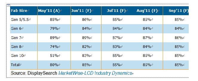 - 6月到9月份TFT LCD面板產(chǎn)能利用率將維持在85%