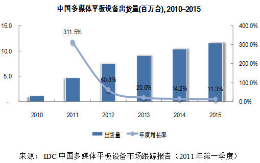 不過,第二季度隨著iPad2 供貨充足以及大量其他核心廠商的新品進(jìn)入市場,IDC預(yù)計中國多媒體平板設(shè)備市場仍將保持超過40%的高速增長。該機(jī)構(gòu)上調(diào)2011年度中國多媒體平板設(shè)備出貨量的預(yù)期數(shù)據(jù)至468萬臺,并預(yù)計2015年出貨量達(dá)到1154萬臺。