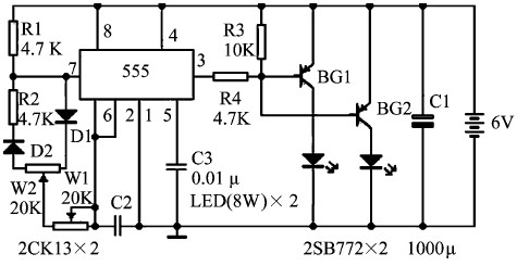 用555 時(shí)基電路可組成各種形式的自激式多諧振蕩器。大功率LED 頻閃光源,主要由1 個(gè)555 多諧振蕩器構(gòu)成的信號(hào)發(fā)生器、1 個(gè)功率放大器和2 個(gè)LED 組成。信號(hào)發(fā)生器的作用是產(chǎn)生所需要的工作頻率脈沖,并且振蕩頻率可以根據(jù)需要調(diào)整。功率放大器將脈沖信號(hào)放大后,驅(qū)動(dòng)大功率LED 發(fā)光。改變信號(hào)發(fā)生器的振蕩頻率,可使光源的頻閃時(shí)間間隔隨之變化;過增、減LED 個(gè)數(shù)或更換不同功率的LED ,可以改變光源的總亮度。如圖3 所示,電路中的555 多諧振蕩器電路,既可以調(diào)節(jié)振蕩頻率,又可以調(diào)整振蕩脈沖的占空比。信號(hào)發(fā)生器的振蕩頻率就是LED 閃光的頻率,可以根據(jù)拍攝對(duì)象調(diào)整。而振蕩脈沖的占空比,決定了LED 每次頻閃的延續(xù)時(shí)間。