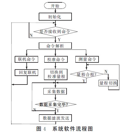 系統(tǒng)軟件采用C語(yǔ)言編寫(xiě),在IAR公司提供的集成調(diào)試環(huán)境Workbech下采用模塊化思想進(jìn)行設(shè)計(jì)。系統(tǒng)的軟件程序固化在MSP430F149單片機(jī)的內(nèi)部Flash存儲(chǔ)器中。系統(tǒng)的程序流程如圖4所示。整個(gè)流程可分為初始化、命令解析、數(shù)據(jù)測(cè)量、數(shù)據(jù)處理及顯示程序。程序設(shè)計(jì)借鑒實(shí)時(shí)操作系統(tǒng)的思想,劃分事件和目標(biāo)。系統(tǒng)按照工作過(guò)程共有命令解析、聯(lián)機(jī)、校準(zhǔn)、測(cè)量判斷、數(shù)據(jù)采集、數(shù)據(jù)打包發(fā)送等幾個(gè)事件,通過(guò)對(duì)事件的處理來(lái)完成相應(yīng)的功能,并進(jìn)行必要的狀態(tài)轉(zhuǎn)換。當(dāng)電壓改變后,接收到測(cè)量命令,進(jìn)入測(cè)量狀態(tài),將數(shù)據(jù)發(fā)送并顯示,回到空閑狀態(tài)繼續(xù)等待命令然后進(jìn)行相應(yīng)的操作。