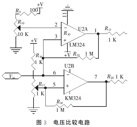 放大后的電壓Vin分別輸入單片機(jī)A/D通道和由LM324組成的上下限電壓比較器,根據(jù)比較器輸出分析信號(hào)幅度是否在規(guī)定范圍內(nèi)。為了使電路工作更穩(wěn)定,比較電壓值需預(yù)留一定的豁量。如圖3所示,調(diào)節(jié)R10使比較上限電壓為2.3V,調(diào)節(jié)R17使比較下限電壓為0.1V,當(dāng)Vin在0.1~2.3V時(shí),量程合適,比較器輸出邏輯電平00,啟動(dòng)A/D轉(zhuǎn)換電路。否則,當(dāng)Vin>2.3V時(shí),通過(guò)模擬開(kāi)關(guān)MAX312并配合軟件來(lái)切換I/V轉(zhuǎn)換電路的反饋電阻,向大量程切換;當(dāng)Vin<0.1V時(shí),向小量程切換,以適應(yīng)不同強(qiáng)度的光信號(hào)。
