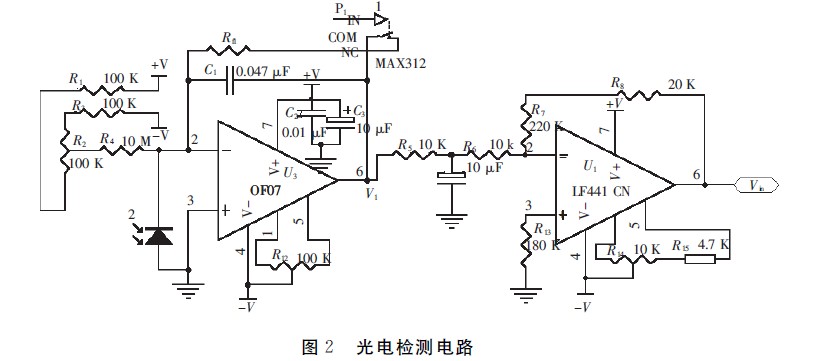 亮度測(cè)量電路由I/V轉(zhuǎn)換電路和二級(jí)放大電路組成。OLED器件發(fā)出的光入射到光敏二極管GT101,輸出僅0.002~200μA 的電流信號(hào),I/V轉(zhuǎn)換電路器件選用具有極低輸入偏置電流的單片電路靜電計(jì)型運(yùn)算放大器OP07.OP07具有低輸入電流和低輸入補(bǔ)償電壓,因此適合作為非常敏感的光敏二極管的前置放大器。如圖2所示,通過(guò)調(diào)節(jié)R12可將運(yùn)放的失調(diào)調(diào)零,R2補(bǔ)償集成運(yùn)放的偏置電流。