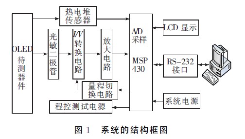 針對(duì)以上問(wèn)題,本文設(shè)計(jì)了一套基于微控制器的OLED光電性能綜合測(cè)試系統(tǒng),系統(tǒng)以微控制器為核心,是一個(gè)將精密恒壓(恒流)電源、電壓電流測(cè)量、溫度測(cè)量、亮度測(cè)量有機(jī)地結(jié)合在一起的測(cè)量系統(tǒng),可實(shí)現(xiàn)測(cè)試條件設(shè)置、數(shù)據(jù)存儲(chǔ)、分析、圖形化顯示、打印輸出等功能,實(shí)現(xiàn)了對(duì)OLED器件光電性能的高精度快速自動(dòng)測(cè)量,使OLED器件的光電性能測(cè)試工作變得方便、快捷、科學(xué)。