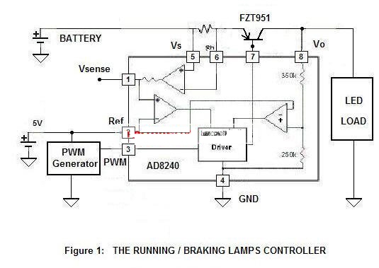 LED的開關取決于CMOS兼容型PWM引腳(AD8240引腳3)上的數(shù)字電壓。對于簡單的開關控制,此電壓可以是連續(xù)的;對于調光控制,此電壓為PWM。PWM頻率應低于500 Hz,占空比范圍從5%到100%。典型值為5%(行駛時)和95%(剎車時)。圖2中,PWM頻率由R1、R2和定時器A1的C1決定。脈沖周期為: