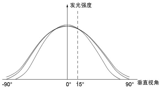 每個燈點在不同的角度觀看時亮度是不同的,且每個燈點隨著角度變化的光強分布曲線也不同。下圖為三顆LED燈點的發(fā)光強度隨垂直視角變化的示意圖線: