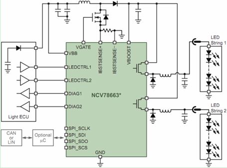 安森美半導(dǎo)體針對(duì)LED汽車前照燈系統(tǒng)開(kāi)發(fā)了NCV78663電源鎮(zhèn)流器及雙LED驅(qū)動(dòng)器。NCV78663是先進(jìn)的高可靠性、高能效的系統(tǒng)級(jí)芯片(SoC) LED驅(qū)動(dòng)器,支持達(dá)2 A電流,提供高于90%的總能效,驅(qū)動(dòng)高達(dá)60 V電壓的多串LED,能以PWM調(diào)光維持色溫及控制平均電流,使設(shè)計(jì)人員能夠以一顆高集成度的SoC控制遠(yuǎn)光燈及近光燈、日間行車燈、轉(zhuǎn)向指示燈及霧燈,所需外部元件極少。這器件通過(guò)SPI接口與外部微控制器通信,在上電后動(dòng)態(tài)地控制系統(tǒng)參數(shù)、檢測(cè)LED工作狀態(tài)并反饋診斷信息。圖4顯示的是NCV78663在先進(jìn)的汽車前照燈應(yīng)用中的電路圖。