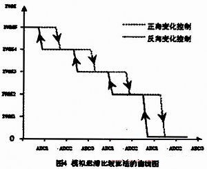 亮度感應(yīng)自動控制的模擬遲滯比較算法將PWM的背光控制分成五段,四個模擬遲滯比較算法控制。每個模擬遲滯比較器有兩個閾值A(chǔ)DC值,分別稱為正向閾值A(chǔ)DC和負(fù)向閾值A(chǔ)DC。在環(huán)境亮度輸入信號從低電平(暗)上升到高電平(亮)的過程中使PWM電路狀態(tài)發(fā)生變化的輸入ADC稱為正向閾值A(chǔ)DC,在輸入信號從高電平(亮)下降到低電平(暗)的過程中使PWM電路狀態(tài)發(fā)生變化的輸入ADC稱為負(fù)向閾值A(chǔ)DC。例如ADC2是正向閾值A(chǔ)DC,ADC1是負(fù)向閾值A(chǔ)DC,在環(huán)境亮度輸入信號從ADCI低電平(暗)上升到ADC2高電平(亮)的過程中,使PWM狀態(tài)由PWN5轉(zhuǎn)變?yōu)镻WM4;在環(huán)境亮度輸入信號從ADC2高電平(亮)下降到ADC1低電平(暗)的過程中,使PWM狀態(tài)由PWN4轉(zhuǎn)變?yōu)镻WM5。這樣設(shè)計成阻止環(huán)境亮度輸入信號出現(xiàn)微小變化(低于某一閾值A(chǔ)DC)而引起輸出PWM的改變,確保穩(wěn)定的液晶面板背光控制。如圖4亮度感應(yīng)自動控制的模擬遲滯比較算法的曲線圖所示。