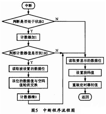 在狀態(tài)2下,參數(shù)設(shè)定時,設(shè)定位要實現(xiàn)閃爍,以確定正在被設(shè)置的數(shù)據(jù)位。實現(xiàn)閃爍的基本思想是每隔500 ms,當(dāng)前閃爍數(shù)據(jù)位的段碼值就由數(shù)據(jù)狀態(tài)變?yōu)榭沾a狀態(tài),下一個500 ms再由空碼狀態(tài)變?yōu)閿?shù)據(jù)狀態(tài),并不斷循環(huán)執(zhí)行此操作(共陽極顯示方式下空碼值為0XFF)。這樣,從用戶角度看,當(dāng)前被設(shè)定的數(shù)據(jù)位就是閃爍的。這里可通過設(shè)定一個計數(shù)器來確定轉(zhuǎn)換時間,當(dāng)計數(shù)值達(dá)到500/2.78(約為180)時,當(dāng)前閃爍數(shù)據(jù)位就進(jìn)行段碼值轉(zhuǎn)換。本系統(tǒng)的中斷程序流程圖如圖5所示。