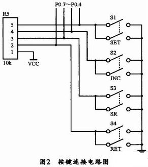 獨立式鍵盤通常用在按鍵較少的系統(tǒng)中,每個按鍵單獨占有一根I/O口線,各鍵的工作狀態(tài)相互獨立,互不影響。由于本文的顯示面板的調(diào)節(jié)按鍵只有4個,因此,設(shè)計使用獨立式按鍵接法。其鍵盤接口電路如圖2所示。