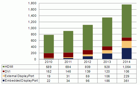 去年In-Stat 觀察到HDMI在移動(dòng)消費(fèi)性裝置上有快速成長(zhǎng),例如手持式高清攝影機(jī)、數(shù)碼相機(jī)等。而在電腦的部分,今年起HDMI在移動(dòng)電腦 (包含筆記本電腦、上網(wǎng)本和平板電腦等)、繪圖卡、以及電腦顯示器等等的搭載比重正不斷攀升。根據(jù)In-Stat最新的PC/Display Interface By Device, Q4’11 Forecast (電腦與顯示器接口統(tǒng)計(jì)數(shù)據(jù)庫(kù)與預(yù)測(cè))報(bào)告指出,2011年搭載有HDMI接口的移動(dòng)電腦的數(shù)量為1億4千8百萬(wàn)臺(tái)(包括筆記本電腦、上網(wǎng)本和平板電腦等),相較于2010年的1億零3百萬(wàn)臺(tái)的出貨成長(zhǎng)了43%;而在移動(dòng)電腦不斷強(qiáng)調(diào)高分辨率多媒體數(shù)字娛樂(lè)播放的趨勢(shì)之下,預(yù)計(jì)2014年搭載有HDMI接口的移動(dòng)電腦的數(shù)量將可達(dá)3億臺(tái)以上。另外,Embedded DsiplayPort的接口成長(zhǎng)亦十分快速,搭載有Embedded DisplayPort的移動(dòng)電腦裝置預(yù)計(jì)將由2010年的8百萬(wàn)個(gè)快速成長(zhǎng)到2014年的3億個(gè)以上。