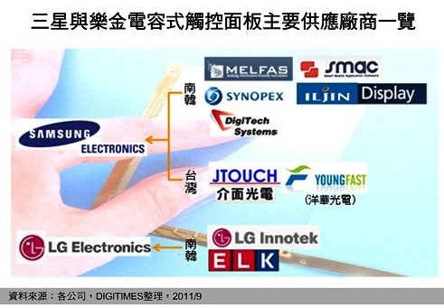 DIGITIMES Research 分析,相較于樂金主要向韓廠LG Innotek與ELK (Electro Luminescence Korea)采購(gòu)觸控面板,三星不僅向Melfas、SMAC (Smart Mobile Application Company)、Synopex、Iljin Display、Digitech Systems、Moreens等韓廠采購(gòu),亦向日廠、臺(tái)廠與大陸業(yè)者采購(gòu)觸控面板,可知三星于觸控面板采購(gòu)多角化發(fā)展較樂金顯著。