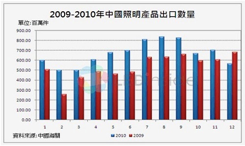 集邦科技旗下研究部門 LEDinside 研究指出,中國目前已成為照明燈具產(chǎn)品的制造大國,將近70%的照明產(chǎn)品都是由中國地區(qū)所生產(chǎn),以白熾燈來說更是如此。LEDinside調(diào)查指出,2010年白熾燈、鹵鎢燈、(緊湊型熱陰極)螢光燈與其他燈具的每月平均出口數(shù)量達(dá)6.67億件,金額達(dá)11.40億美元;總計(jì)2010年出口數(shù)量達(dá)79.9億件且金額達(dá)136.77億美元,相較於2009年,數(shù)量成長24.2%,且金額成長34.7%。