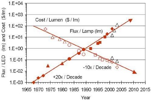 依據(jù)過去30年LED發(fā)展觀察,Lumileds Lighting公司的Roland Haitz先生于2003年歸納出LED界的Moore(摩爾)定律—Haitz定律(如圖1所示),說明LED約每18~24個月可提升一倍的亮度,以此定理推估10年內(nèi)LED亮度可以再提升20倍,而成本將可降90%以達(dá)到可完全取代現(xiàn)有照明技術(shù),因此LED照明于近幾年火熱的被重視與探討。