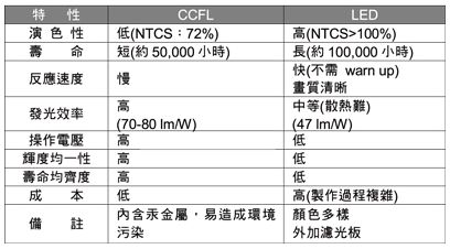 LED因耗電低、不含汞、壽命長、體積小、降低二氧化碳排放量等優(yōu)勢吸引國內(nèi)、外廠商極力推廣取代現(xiàn)有照明。 LED主要照明可分為顯示背光、車用照明、交通號志與室內(nèi)室外照明,而背光模組于2009年被廣泛的應(yīng)用于筆記型電腦面板上,此后亦逐漸被使用到家用電視機(jī),其約占了50%之面板模組零組件制造成本與消耗約70%顯示器之電能,故背光照明為顯示面板最重要的關(guān)鍵。 然液晶顯示器無法自行發(fā)光,因此需要背光模組作為光線的來源,所以背光源的好壞會影響顯示的效果甚劇。 加上面板需薄型化的因素,因此多以CCFL燈管作為背光源,而LED背光源比起CCFL有演色性佳、壽命長、反應(yīng)速度快等優(yōu)勢(如表1)。