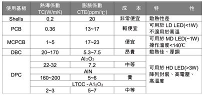 在陶瓷材料上以DPC成型之基板,具有耐高電壓、耐高溫、與LED熱膨脹系數(shù)匹配等優(yōu)勢外,還可將熱阻下降到10℃/W以下,故此為現(xiàn)今最合適用在封裝高密度排列之HB LED散熱材料。