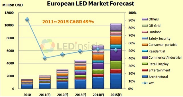 根據(jù)LEDinside調(diào)查, 2011年歐洲 LED照明市場約達20億美元以上,大約占全球 LED照明市場28%。盡管歐洲市場因為歐債而在 2011年有受到影響,但歐盟已經(jīng)積極解決,也反應在市場上,隨著LED規(guī)格不斷的提升及大幅度降價等影響,LEDinside預估歐洲 LED照明市場每年都將會有大幅度成長,2015年歐洲 LED照明市場將會突破100億美元規(guī)模。