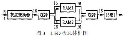 由此類推,把CRT 顯示的一幀單色畫面分成N場在L ED 點陣屏上顯示,每場顯示的時間為TPN ,在各場中,各像素由其對應(yīng)的控制碼來控制L ED 的通斷,通過視覺的積分效應(yīng),就產(chǎn)生了整個畫面的灰度效果。